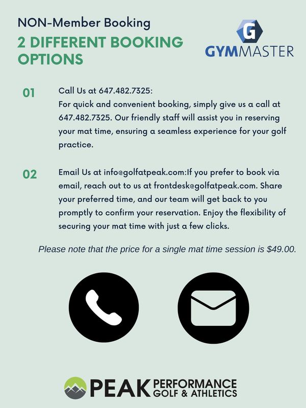 Book Your Mat Time For Members: Members, elevate your golfing journey with ease! Utilize the Gym Master app to seamlessly book mat times and access exclusive perks at Peak Performance Golf & Athletics. Your path to enhanced skills and enjoyment starts here. Book Now, including Mat Time Session holders!